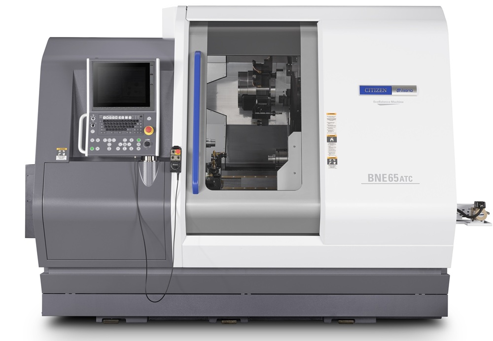 Citizen Machinery has developed the “Miyano BNE-65ATC,” a fixed-headstock CNC automatic lathe. One station on one of the two turrets features B-axis functionality capable of approaching workpieces from both front and back. This enables milling and drilling at any angle, allowing more accurate and faster machining of complex-shaped workpieces.