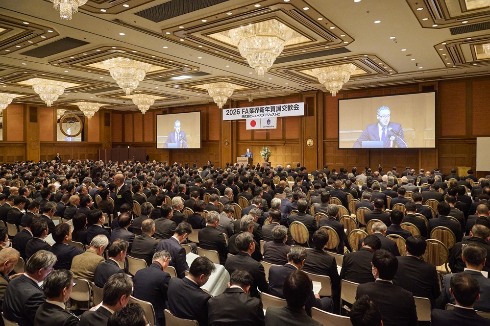 The 2026 FA Industry New Year’s Reception, hosted by News Digest Publishing (ND), was held on January 9 at the Nagoya Kanko Hotel in Nagoya. The event attracted 755 attendees, including business leaders from the factory automation (FA) industry. Both Dr. Shu Yasumi, President and Editor-in-Chief of ND/SEISANZAI Japan, and Shigetomo Sakamoto, Chairman of the Japan Machine Tool Builders’ Association (JMTBA) and President of Shibaura Machine, presented identical forecasts of JPY 1.7 trillion for this year’s machine tool orders. SMC President Yoshiki Takada received the ND Marketing Grand Prize, along with a certificate of commendation and a bronze statue. The event also featured a New Year top executive interview panel with presidents from Okuma, Makino Milling Machine, and FANUC.