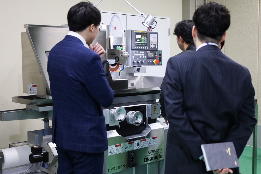 The showroom also featured several other grinding machines, including the surface grinder “PSG63SA1” equipped with a large touch panel and the “PSG64CA-iQ,” which incorporates Okamoto’s proprietary interactive software.