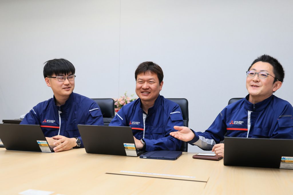 From right: Manager Tatsuhiro Ujiie of the Production Engineering Center, Masaaki Sakakibara (welding), and Kakeru Kosaka (machining)